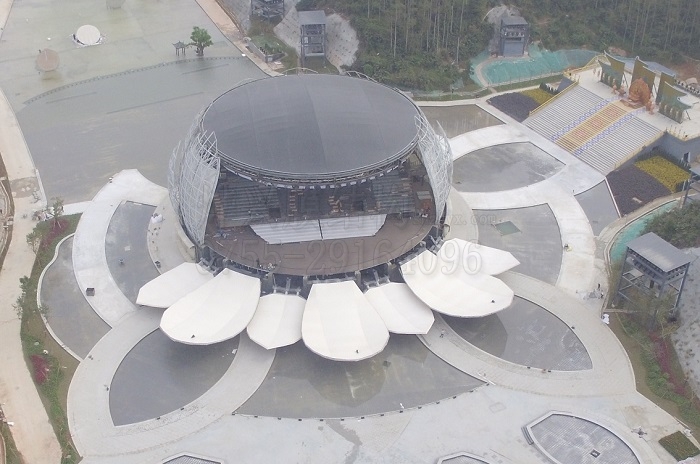 工程情況:燁興-云浮蓮花PTFE膜結(jié)構(gòu)是可作360度自由旋轉(zhuǎn)的大型蓮花劇場舞臺,由10個近千平方米的大花瓣和10個小花瓣圍成的花朵在需要時可進(jìn)行展開或閉合操作,花瓣外膜全部采用進(jìn)口PTFE膜結(jié)構(gòu)制成,內(nèi)襯則采用PTFE網(wǎng)格膜,膜結(jié)構(gòu)工程總量11280平方米。