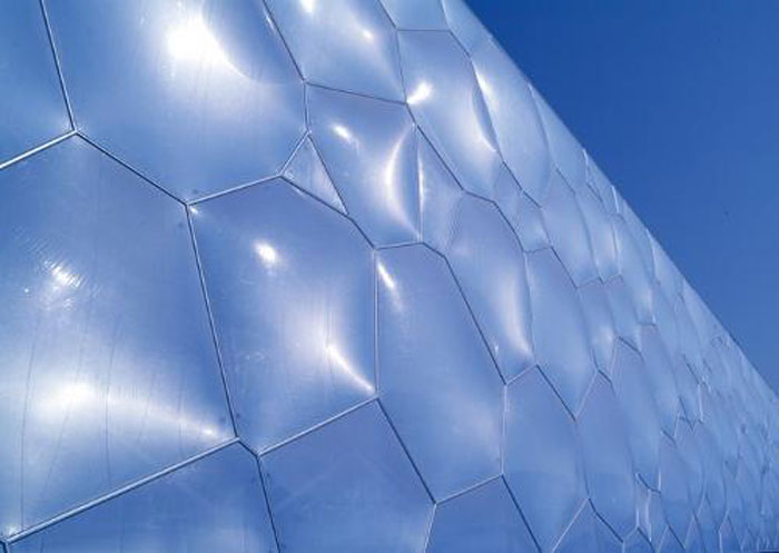 隨著膜材方面科學(xué)技術(shù)的不斷發(fā)展,目前的膜材耐久性可達(dá)25~30年,成為永久性建筑的良好選材。膜材厚度一般為1mm左右,它應(yīng)用于建筑既是受力構(gòu)件,又是維護(hù)構(gòu)件,因此,膜材被譽(yù)為繼石材、木料、鋼材、玻璃和混凝土之后的“第六種建材”。ETFE(乙烯聚四氟乙烯)膜材則是一種全新型建筑膜材,它是一種聚合物擠出材料,各項(xiàng)性能均優(yōu)于其他膜材產(chǎn)品,在耐火、耐久、透光等方面的性能與玻璃相當(dāng)。應(yīng)用ETFE膜材的膜氣枕系統(tǒng)其結(jié)構(gòu)形式推陳出新,在結(jié)構(gòu)、安全、可持續(xù)性等方面具有顯著的優(yōu)勢。本文將就以下幾個(gè)方面給大家介紹一下ETFE膜氣枕系統(tǒng)的優(yōu)點(diǎn)。