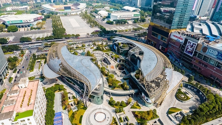 天環(huán)的建筑設(shè)計概念來自中國文化中象征著和平、和諧和財富的鯉魚,不銹鋼硬殼型結(jié)構(gòu)屋頂酷似兩條游動的魚,透明的ETFE膜是魚鱗。
