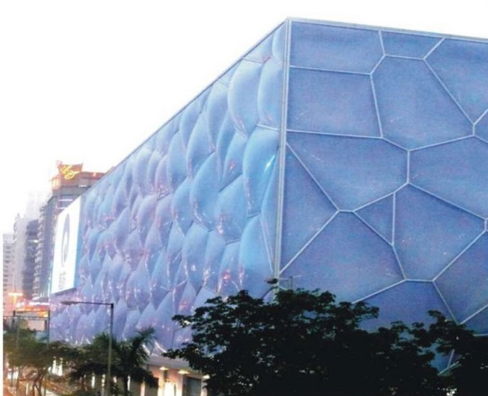 實(shí)際上,作為特意研發(fā)的“軟玻璃”,ETFE膜結(jié)構(gòu)具有非常優(yōu)良的物理化學(xué)性能。在抗打擊能力方面,每單位ETFE膜材具有50Mpa以上的抗拉強(qiáng)度、300%以上的抗張伸展率,這樣的強(qiáng)度,甚至超過(guò)相同規(guī)格的鐵皮,除非特意用刀子或者其它尖銳物戳刮,否則人力很難破壞。
