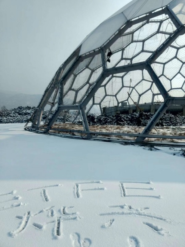 往日里熱鬧的ETFE熱帶植物園項目工地已經(jīng)安靜下來,遠(yuǎn)遠(yuǎn)望去,三個巨大的鋼結(jié)構(gòu)半球靜靜倒扣在冰天雪地中,已經(jīng)開始裝膜的1#球頂部雪白,那是新裝的ETFE膜面攔住了積雪。雖未完工,但已經(jīng)顯露出該有的壯觀宏大氣象。