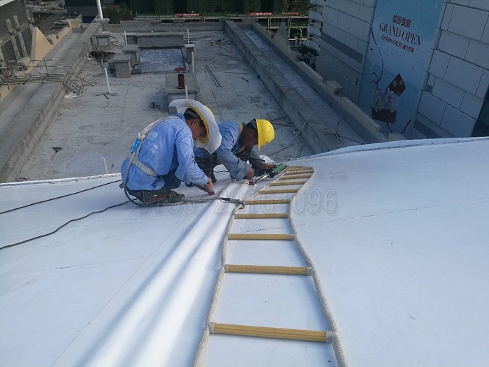 在我們施工的過程中,臺風(fēng)、連續(xù)降雨天氣頻繁出現(xiàn),對正常施工造成了較大影響。值得高興的是,只安裝部分膜材的半成品工程經(jīng)受住了臺風(fēng)的考驗——鋼構(gòu)堅固、裝膜牢靠、安全;我們的工人隊伍也克服了惡劣天氣帶來的影響,按照施工計劃穩(wěn)定推進了工作進度。