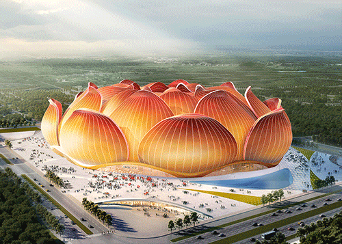 從恒大公開的資料中,足球場(chǎng)被設(shè)計(jì)為極具中國(guó)文化氣韻的蓮花綻放造型,但因?yàn)榫W(wǎng)上流傳的效果圖五顏六色,已經(jīng)被其它另類建筑荼毒過眼球的網(wǎng)民聽說這個(gè)項(xiàng)目是恒大大老總親自構(gòu)思及審查的,腦海里自行腦補(bǔ)了一個(gè)場(chǎng)面:財(cái)大氣粗的老總用自己“粗俗”的審美要求相關(guān)人員設(shè)計(jì)了這個(gè)有點(diǎn)“庸俗”的蓮花綻放造型方案,所以紛紛吐槽這個(gè)項(xiàng)目老土。但從專業(yè)角度看,效果圖并不能代表實(shí)際成品,特別是當(dāng)你用對(duì)某種建筑形式的時(shí)候,實(shí)際工程效果會(huì)有一個(gè)脫胎換骨的變化。假如采用膜結(jié)構(gòu)來實(shí)施這個(gè)設(shè)計(jì)方案,如廣東云浮新興縣禪宗圣域的蓮花劇場(chǎng)項(xiàng)目,從概念圖到實(shí)際完工效果,因?yàn)檫x對(duì)建筑形式,建筑效果出現(xiàn)了升華。