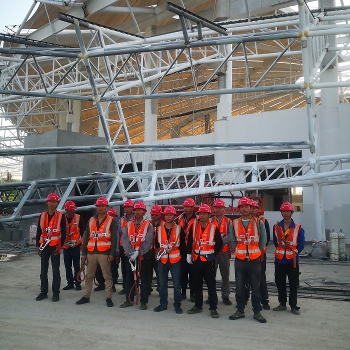 燁興-京山網(wǎng)球膜結(jié)構(gòu)工程是湖北新全民健身示范項(xiàng)目,項(xiàng)目還在建設(shè)中,參觀考察的單位就絡(luò)繹不絕。對(duì)這個(gè)項(xiàng)目,我們燁興也是高度重視,從設(shè)計(jì)到選材用料,再到施工工藝,都是按最好的標(biāo)準(zhǔn)去落實(shí)。
